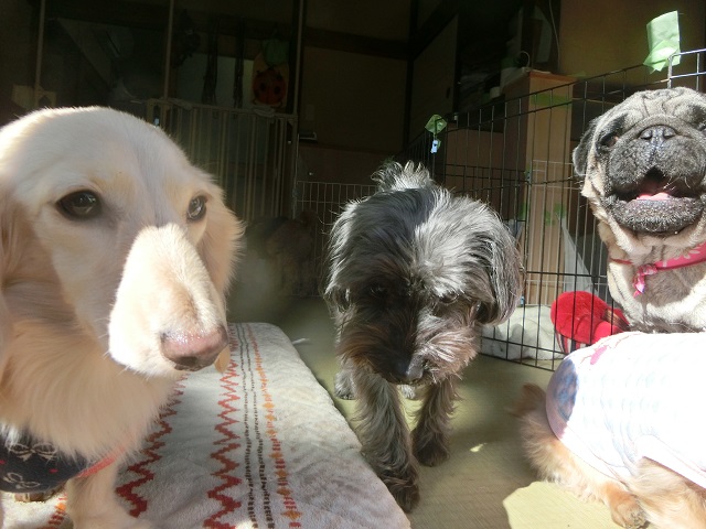 真顔のダックスお嬢様、半分黒いmixちゃん、そして何か話そうとしているパグくん。