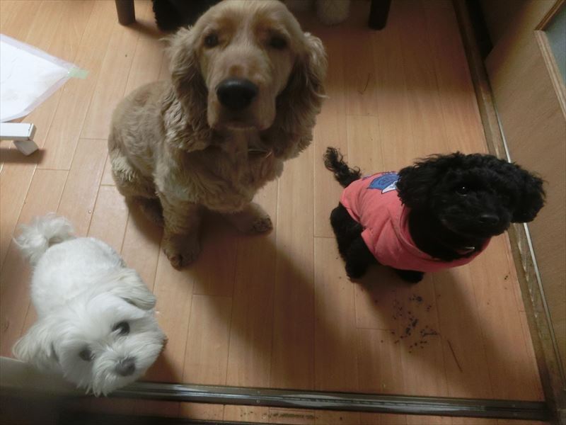 中央のコッカちゃん少し警戒気味だったのですが、他の子たちが穏やかで優しいのがわかると、すっかり落ち着いて過ごせるようになってくれて、表情もこの通り・・・