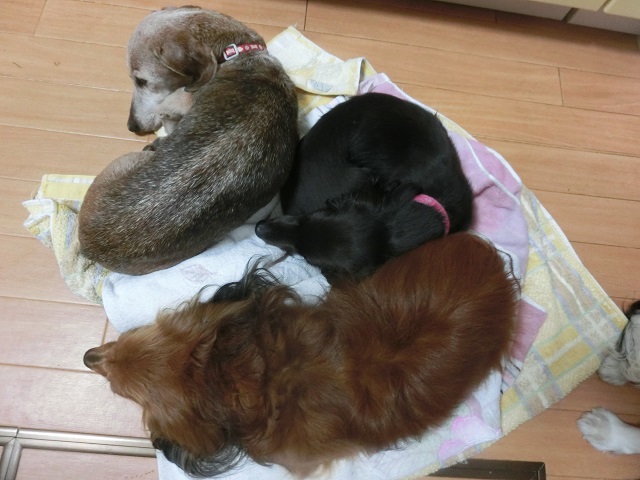 タオルの上も心地よい。ということで、みんなで上手にシェアして寝ていました。