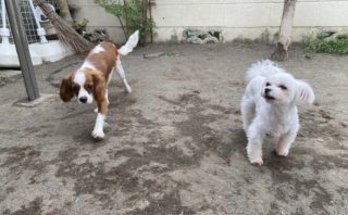 今回初滞在のダックスさんも、ちょっと先輩のシニアパピヨンさんと一緒に朝のあいさつをしたり、