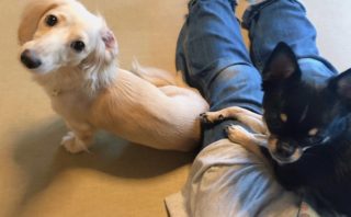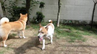 1歳のビーグルくんは、何に対しても興味津々。先輩ダックスちゃんも参加して、とりあえずシッポを