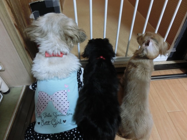 プリティーなおしりがみっつ並んで、何を観察しているのでしょう。真ん中のダックスちゃんは長期の