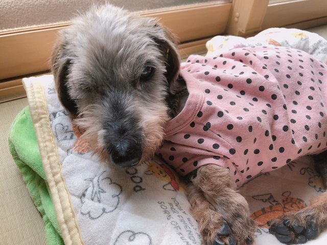 御年15歳のダックスちゃん。いつものお気に入りの窓辺で至福の二度寝タイムを。ごはんも食べて、