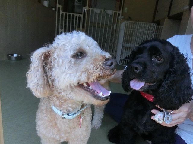 〈友達たくさん、湘南茅ヶ崎のペットホテル〉窓辺トーク ペットホテル日誌 2014.06.15 「ねね、最近暑くね?」「うん、ちょー暑いよね。私、黒いから余計に。」 すっかり仲良くなった二人、こんな会話をしていた。ような…コッカーちゃん、すっかりトイプーちゃんが 気に入って、ぴったりマーク。ラブラブ光線にトイプーちゃんは少したじたじでしたが(笑) ともかく、二人ともとっても良い笑顔!ごちそうさんです!! 湘南のペットホテル、毎日素敵な出会いがあふれる、のんびり過ごせるアットホームな一軒家です。