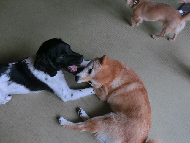 〈友達との楽しいひと時を。湘南茅ヶ崎のペットホテル〉パターン 店舗ブログ 2014.06.18 仲良しの再会。といっても必ず週一回は会えるんですけどね。朝のあいさつもそこそこに、おおはしゃぎで 部屋中をまず走り周る⇒そのあとお庭へダイブして、二人で追いかけっこ⇒また部屋に戻って上の図のように お口を合わせてがーがー遊ぶ⇒速攻でお昼寝。というパターンです、大体(笑)。元気が何よりであります! 湘南のペットホテル、友達がたくさんできる、アットホームなわんこたちの憩いの場です。