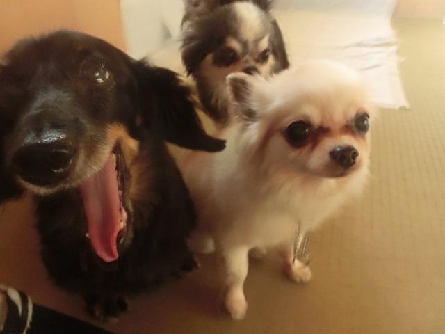 ふぁーっ!!ダックスちゃん、大きなあくびが出ました。その横で、おっとりチワワちゃんが「………。」