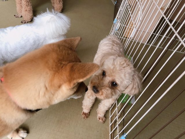 パピー柴ちゃんとトイプーちゃんがご対面。好奇心旺盛な柴ちゃんは、とりあえず誰にでも