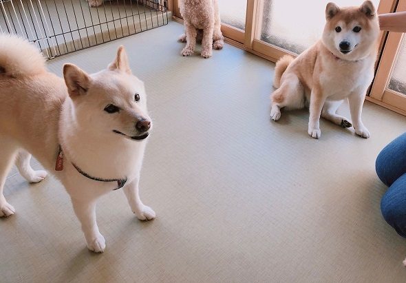 マイペースな柴ちゃんたち。左の子は、これからお外!?みたいな期待の眼差しで(笑)