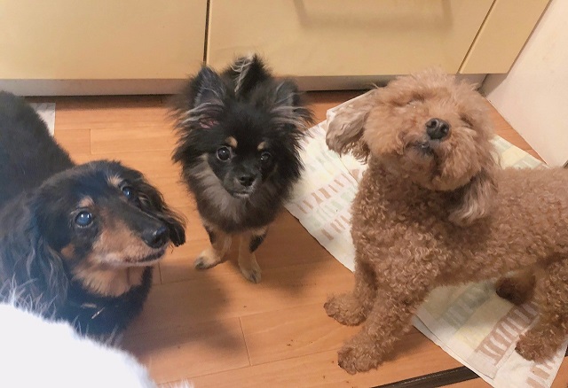 つぶらな瞳がそろって、なんだか期待の眼差し?チワワミックスちゃんも、先輩たちのマネをして(笑)