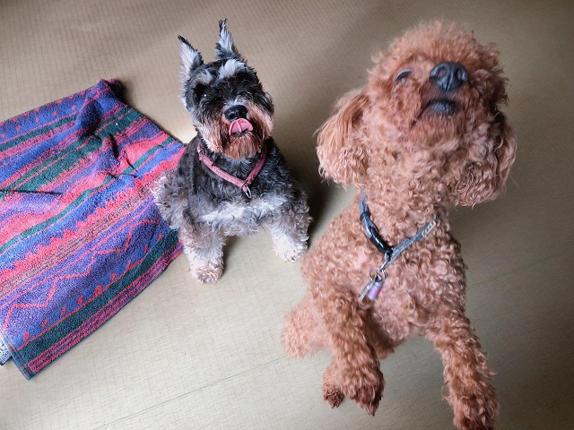 シュナちゃんとトイプーちゃん、なんだか人間に期待の眼差し。シュナちゃんのペロっとキュートな