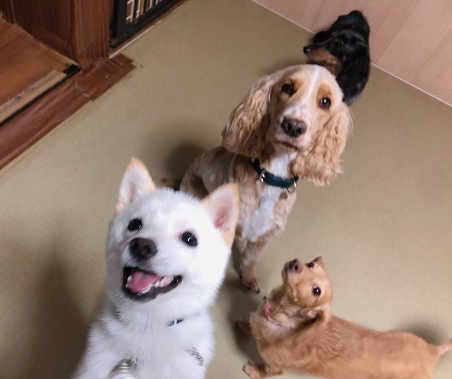 新入りさんのマメシバちゃん。朝から元気な笑顔を見せてくれております。先輩のおっとりコッカーちゃんや
