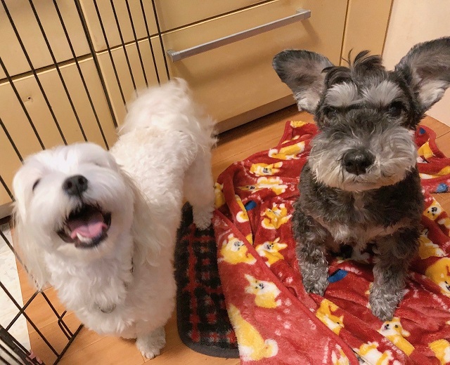 お隣でくつろいでいたマルチーズちゃんもムクっと起き上がって、人間に全力でシッポフリフリ。