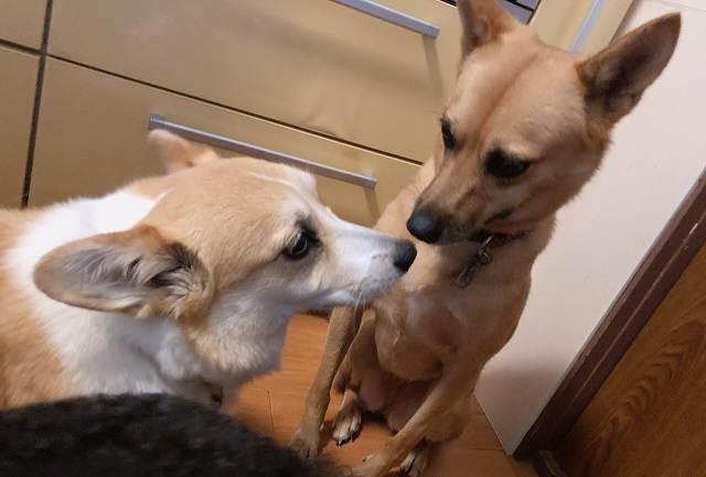今回初滞在のミックスちゃん、先輩のコーギーちゃんからクンクンあいさつ。初滞在のミックスちゃん