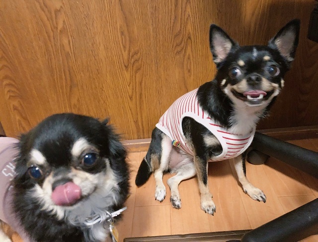 ブラック&クリームのチワワちゃんコンビ。おふたりともちょっぴり控え目で慎重さん。