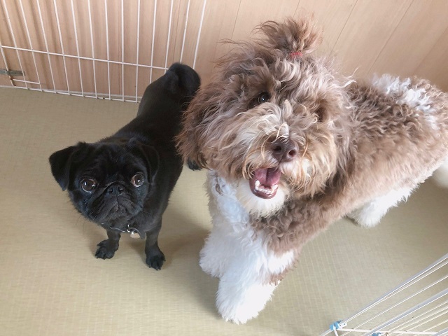 クリクリおめめのパグちゃんとつぶらな瞳がチャーミングなドゥードルちゃん。