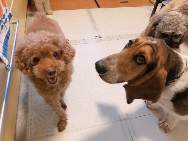 初対面のトイプーちゃんとバセットちゃん。天真爛漫元気いっぱいのバセットちゃんに