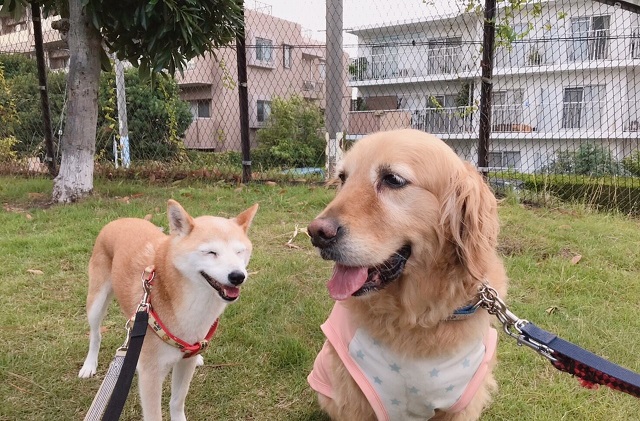 おっとりチームのゴールデンちゃんと柴ちゃん。おふたりとも、とっても気ままで