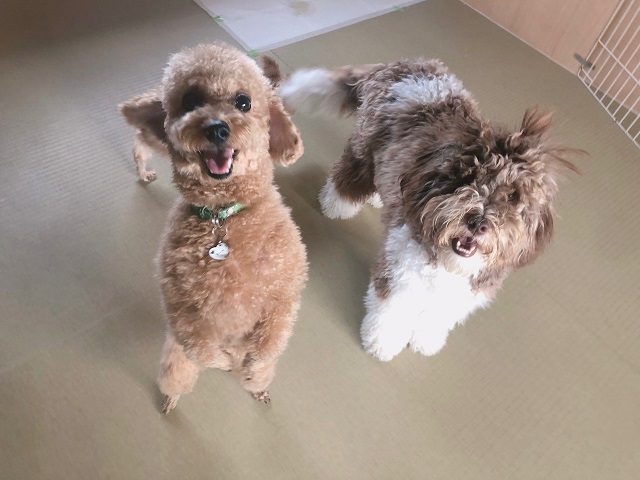 初対面のトイプーちゃんとドゥードルちゃん。上手にクンクンごあいさつもできて、