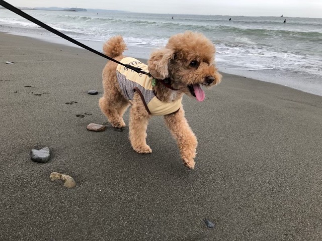 海岸散歩が大好きなトイプーちゃん。波際を軽快な足取りで歩いております。