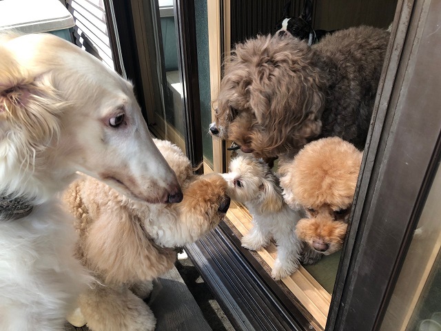 窓辺でご対面中の顔なじみさん+新入りパピーちゃん(真ん中のプーちゃんです)