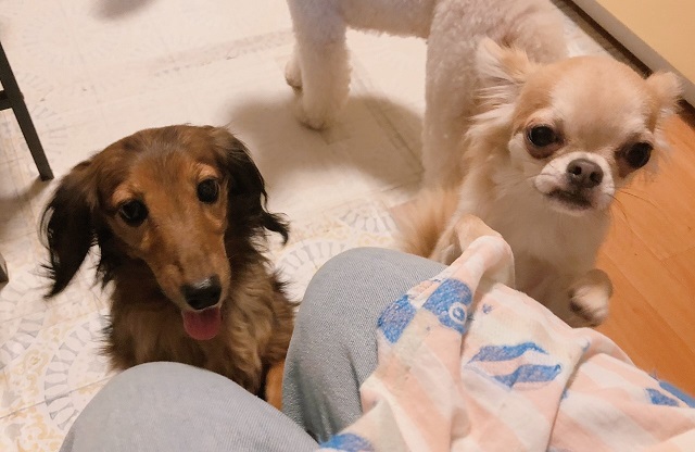 表情も和らいできました。先輩チワワちゃんと一緒に人間に甘えてみたり(笑)