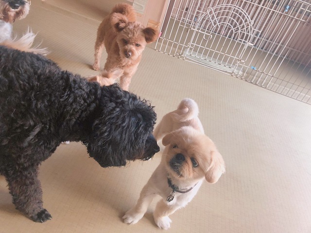 とっても好奇心旺盛なミックスちゃん、いろんな子たちとまずはご対面。先輩のペキニーズちゃん