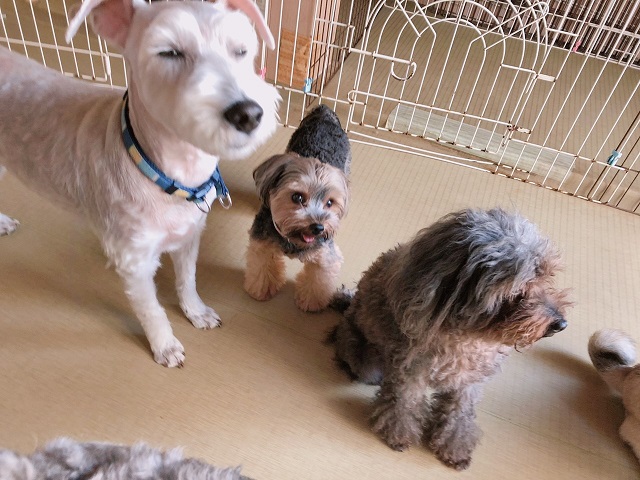 天真爛漫なヨーキーちゃん、まずは先輩たちとクンクンごあいさつから。とってもオープン