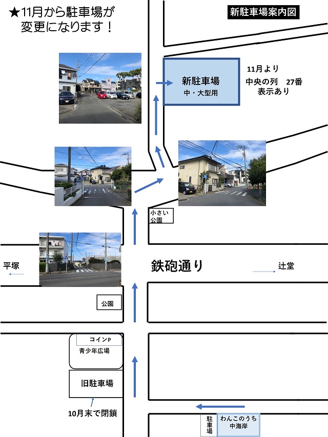 お知らせこの度、現在使用している駐車場が10月いっぱいで閉鎖となるため、つきましては