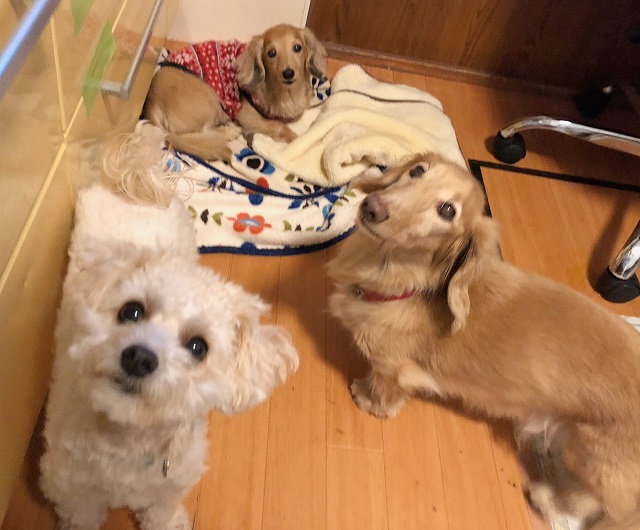 もうすでにくつろぎモードですが(笑)そこへシニアダックスちゃんもトコトコやってきて、