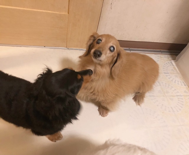 好奇心旺盛なダックスちゃんが、先輩にごあいさつ中。シニアダックスちゃんは、とにかく