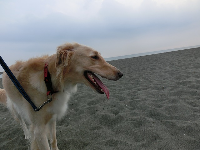 恒例の海岸散歩。夕方の静かな海はとっても美しい。そしてその海を眺めるボルゾイMIXちゃんもまた、美しい。