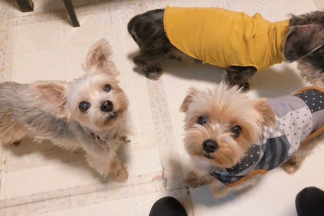 マイペースなヨーキーちゃんコンビ。まんまるの瞳でじーっと見つめる姿が、なんともキュート。