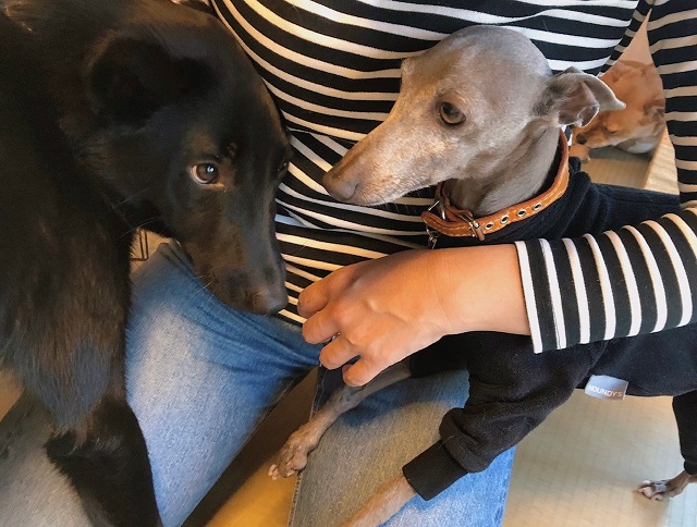 このあと、イタグレちゃんはしっかりお膝にポジショニングしてお昼寝、ミックスちゃんはまた