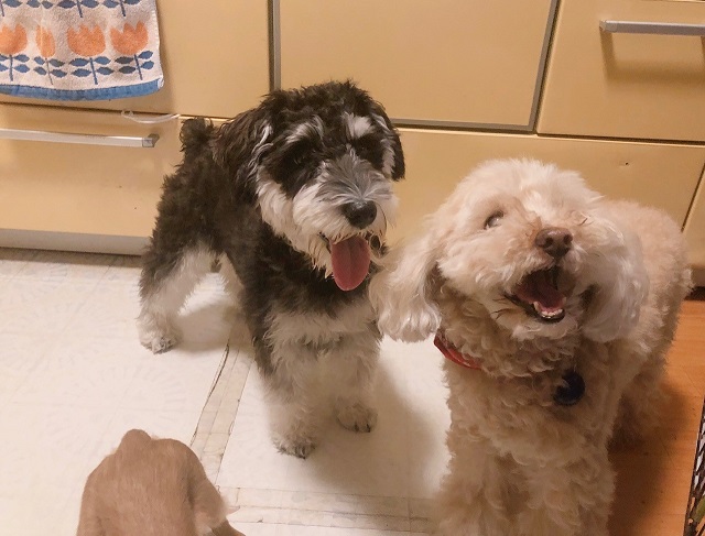 シュナちゃんはしきりに先輩のクンクンごあいさつ。シニアトイプーちゃんは、