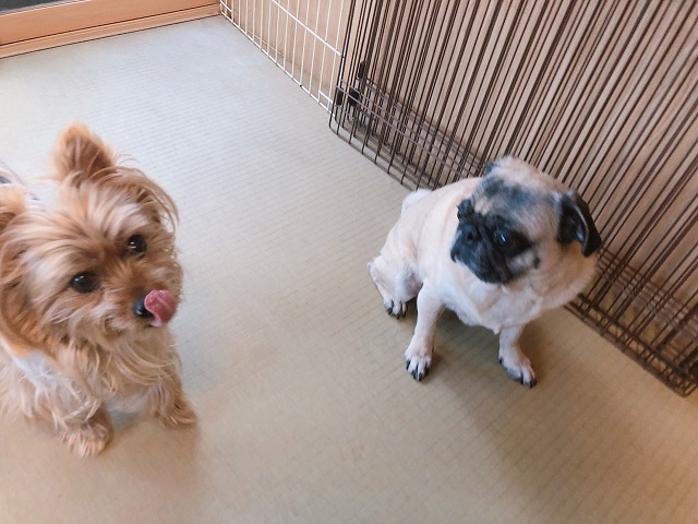 立派なベロをご披露頂いたヨーキーちゃんと、ちょっと控えめなパグちゃん。