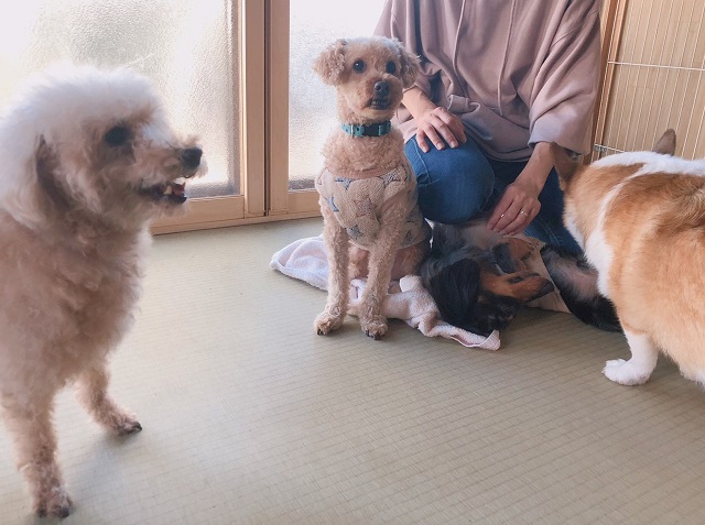 手前の子はお部屋をウロウロしながらみんなの様子を観察、ダックスちゃんは仰向け