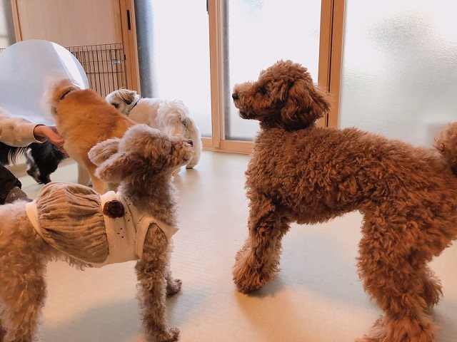 天真爛漫でお若いトイプーちゃん、大先輩にも明るく遊びのお誘い。しっぽをくねくね、