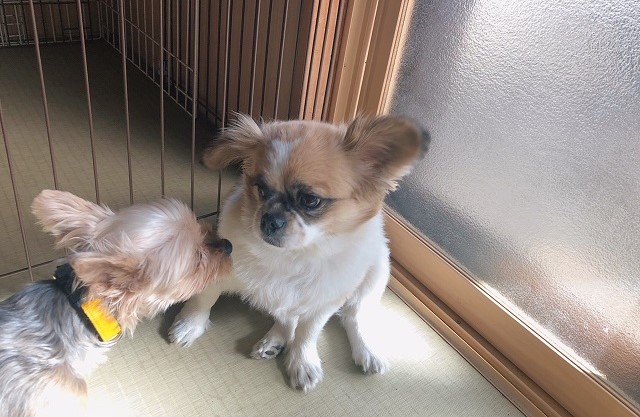 窓際のコーナーでちょこんと座るミックスちゃん、そこへトコトコベテランヨーキーちゃんが
