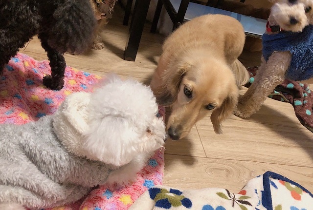 新たなルームメイトのダックスちゃんがやってきたので、一応クンクンだけしてくれて(笑)
