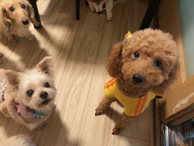 とってもオシャレ。先輩ヨーキーちゃんともお話をしたり、はじめましての子たちと