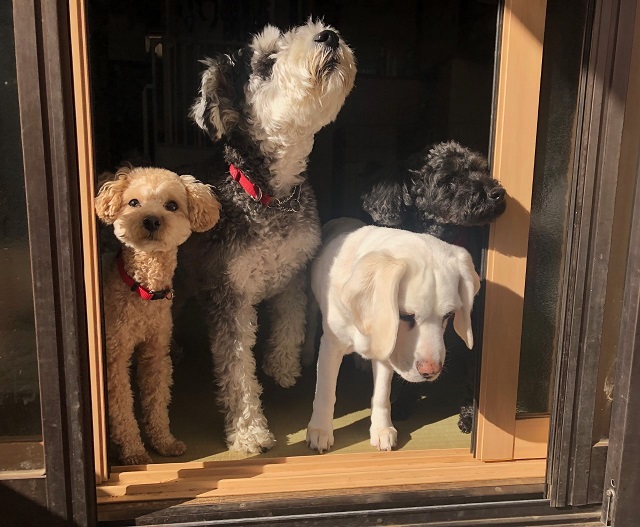 本日の窓辺タイム。それぞれお顔をひょっこり出して、お外の匂いをクンクンしたり、