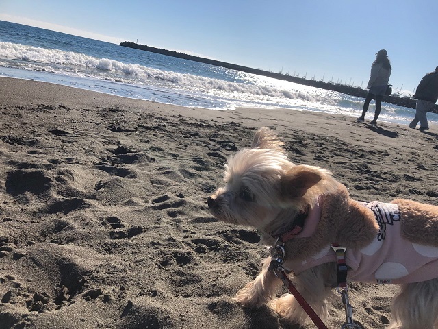 本日はお日柄も良く、ヨーキーちゃんも海岸を元気よく歩いております。海はキラキラ、