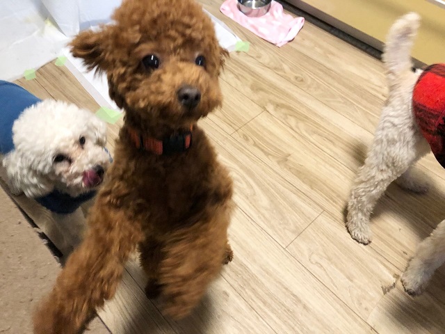 お泊りチームのトイプーちゃん、お耳をぺちゃんこにして、なつこいお顔でリポートして