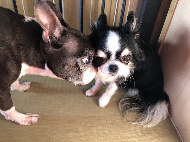 とっても優しいシニアボストンちゃん、はじめましてのチワワちゃんに積極的ごあいさつ。