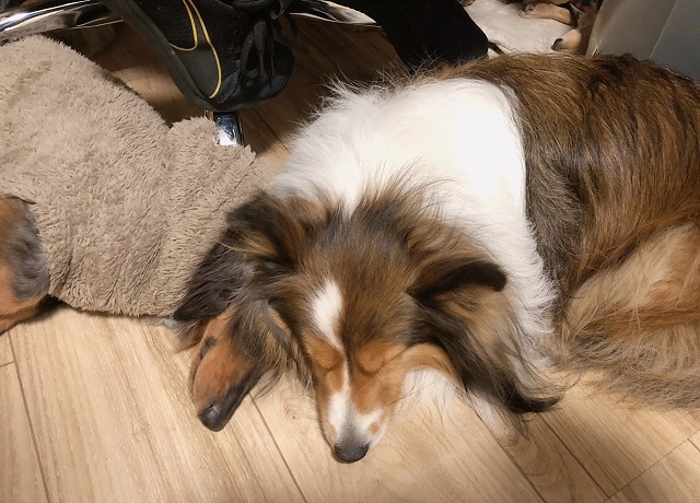 仲良くスヤスヤ。シェルティーちゃんのリッチな毛がダックスちゃんにもフワッとかかって、