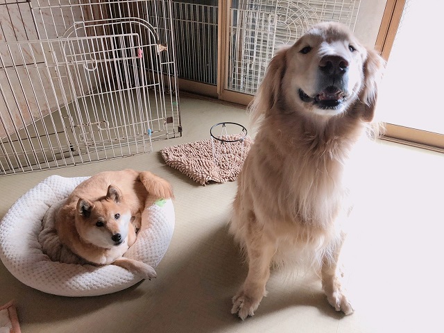 とっても”おぎょうぎ”よく座っているゴールデンちゃんと柴ちゃん。おふたりの穏やかな