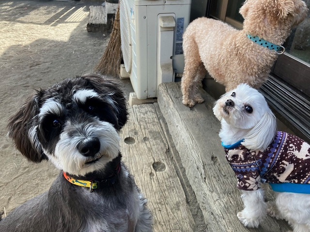 すっかりみんなと馴染んで気ままにお庭タイムを満喫中。ベテランマルチーズくんはそろそろ