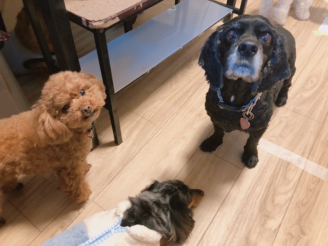 今回初滞在のトイプーちゃんは、そんな様子をちょっと遠巻きに眺めながら、ちょこっと