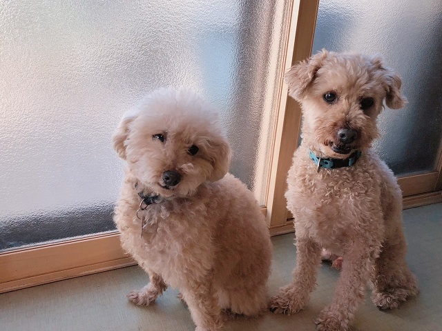 窓辺でトイプーちゃんおふたりがちょこんと座っておりました。首のかしげ具合だったり、