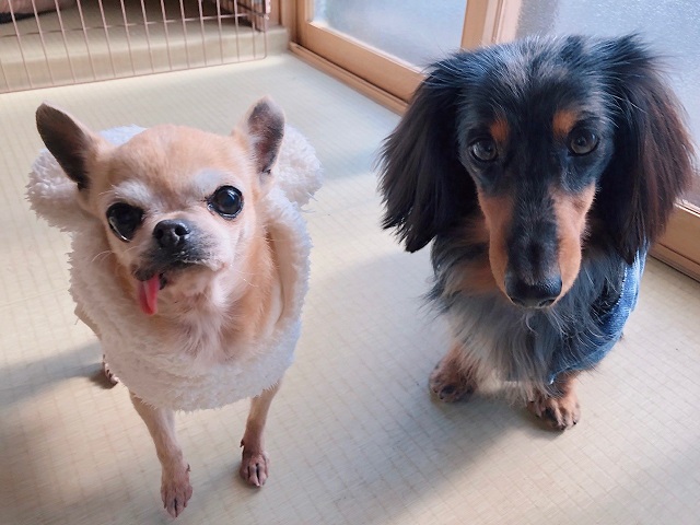 こぼれそうな瞳がとっても印象的なチワワちゃんとダックスちゃん。朝のごあいさつも